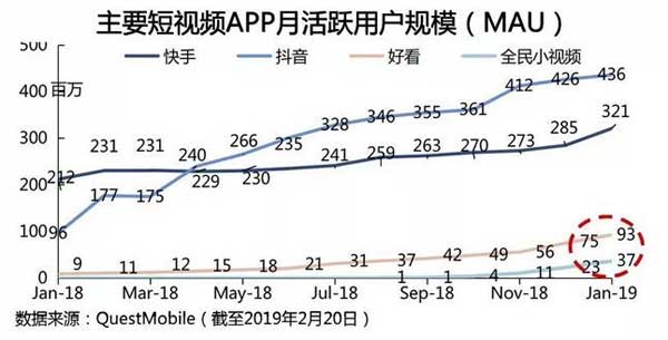 由圖可見,截止2019年1月19日,好看視頻的月活為9300萬,同比增長904%;全民小視頻的月活為3700萬,環比增長60%。