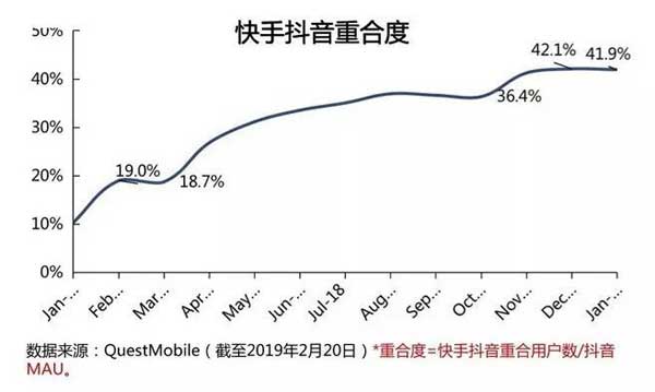 從快手抖音用戶重合度曲線可見,從2018年4月開始,快手抖音的用戶重合度處于上升趨勢,但在2019年1月出現小幅下降。不過,截止2019年1月,二者的用戶重合度已經達到了41.9%。