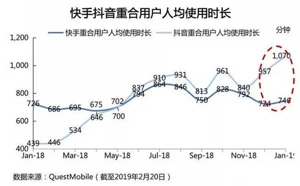 二者的重合用戶中,抖音重合用戶人均使用時長高于快手,并在2018年11月之后呈現擴大趨勢。截止2019年1月,抖音重合用戶人均使用時長為1070分鐘,快手為746分鐘。